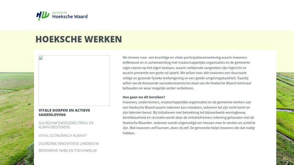 We streven naar een krachtige en vitale participatiesamenleving waarin inwoners zelfbewust en in samenwerking met maatschappelijke organisaties en de gemeente regie voeren op het eigen bestaan, waarin voldoende vangnetten zijn ingericht en waarin preventie een grote rol speelt. We willen voor alle inwoners een duurzaam veilige en gezonde fysieke leefomgeving en een goede omgevingskwaliteit. Daarbij willen we de bestaande sociaaleconomische staat van de Hoeksche Waard minimaal behouden en waar mogelijk verder verbeteren.