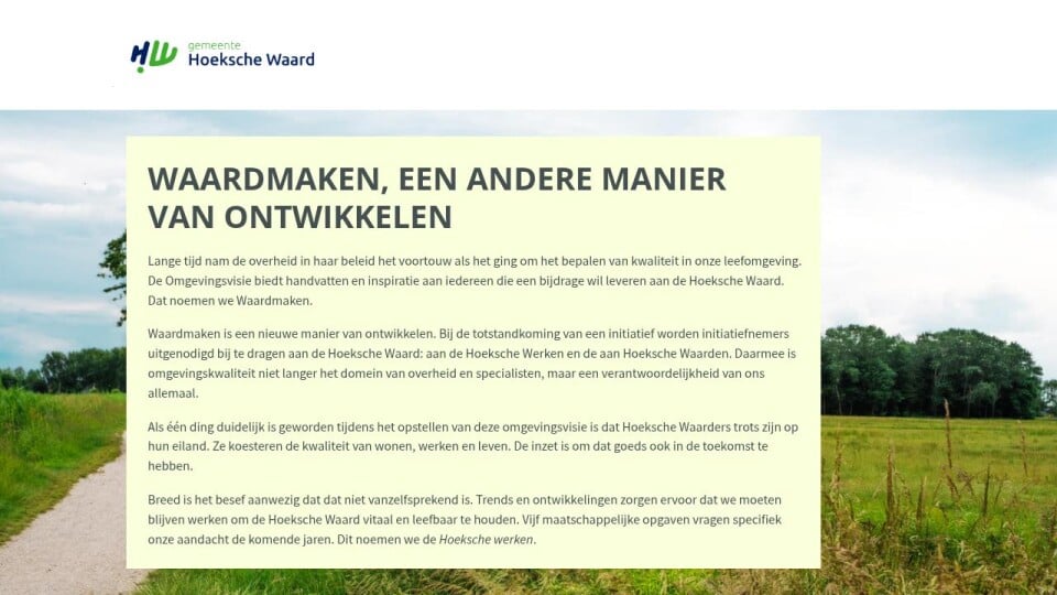 Lange tijd nam de overheid in haar beleid het voortouw als het ging om het bepalen van kwaliteit in onze leefomgeving. De Omgevingsvisie biedt handvatten en inspiratie aan iedereen die een bijdrage wil leveren aan de Hoeksche Waard. Dat noemen we Waardmaken.
