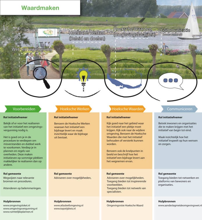 Het ontwerp moet voorzien in versterking van de biodiversiteit. Hiertoe vraagt de initiatiefnemer advies aan het Hoeksche Waards Landschap. Hun betrokkenheid leidt tot een ontwerp met meer omgevingskwaliteit, en er ontstaat draagvlak. De vakantiehuisjes worden ingepast in de schaal van de oude rivierarm. Kleinschalig en met het gevoel van een park. Met visualisaties toont de initiatiefnemer aan hoe het initiatief in de omgeving past. Een aantal omwonenden heeft nog twijfels, onder andere over hun privacy en de ontsluiting van de huisjes. In overleg past de initiatiefnemer het plan aan. Nu zijn ook de meeste omwonenden overtuigd.